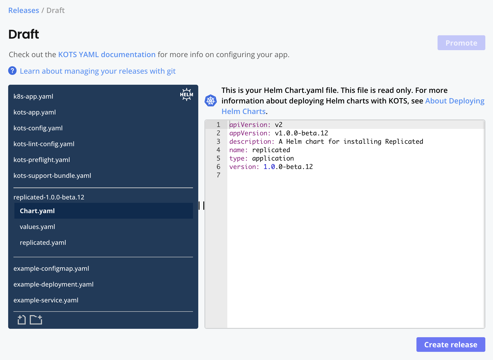 If one was not created automatically, add a KOTS HelmChart custom resource to the release. HelmChart custom resources have